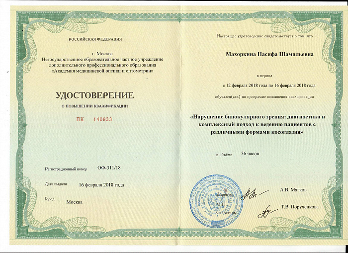 - Усовершенствование по контактной коррекции на базе Московского филиала международного Института The Vision Care Institute;
