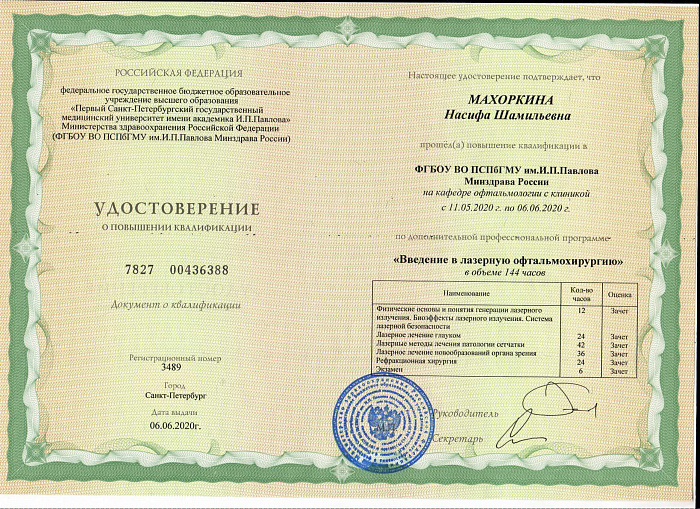 2000 г. Интернатура в Ульяновской областной клинической больнице N1 присвоена квалификация врача офтальмолога.