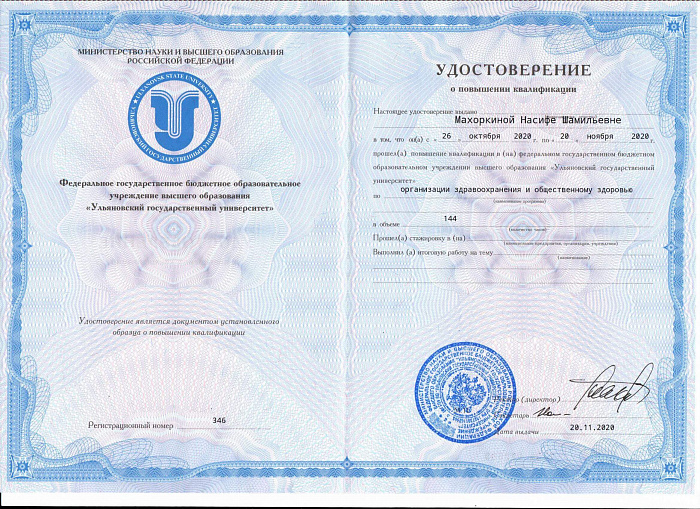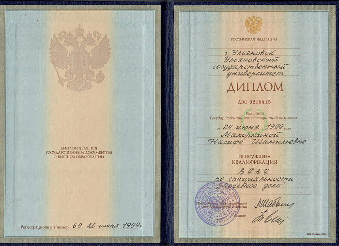 1999 г. Ульяновский государственный университет присуждена квалификация врач по специальности «Лечебное дело»